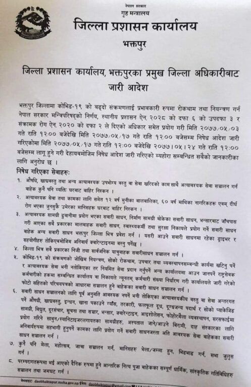 भदौ ३ को मध्यरातदेखि जारी निषेधाज्ञा बुधवार मध्यराति सकिने भएपछि अरु एक साता निषेधाज्ञा लम्ब्याउने निर्णय गरिएको भक्तपुरका प्रमुख जिल्ला अधिकारीले जानकारी दिएका छन् ।