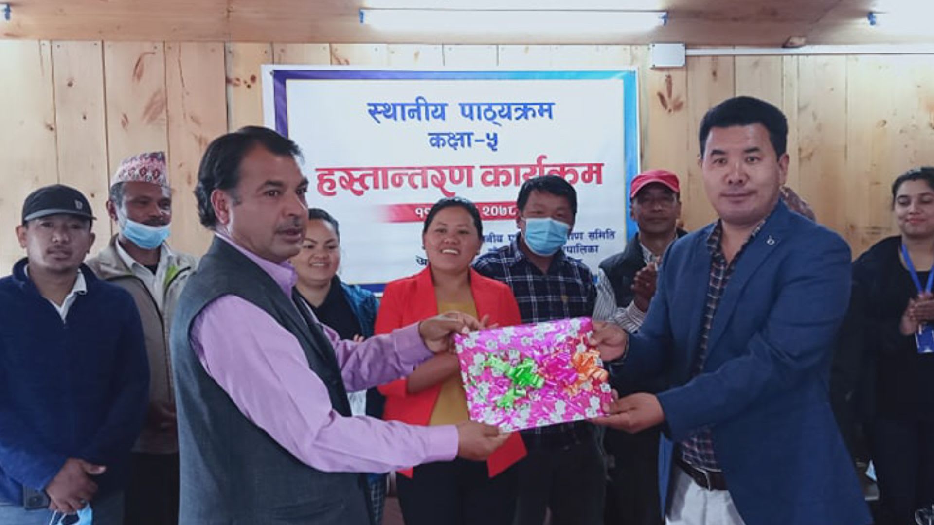 सोलुखुम्बु बहुमूखी क्याम्पसका प्रमुख तथा पाठ्यक्रम निर्माण समितिका संयोजक उद्धवकुमार शर्माले साझा स्थानीय पाठ्यक्रम तयार पारेर नगरप्रमुख नाम्गेलजाङ्बु शेर्पालाई हस्तान्तरण गर्नुभएको हो ।