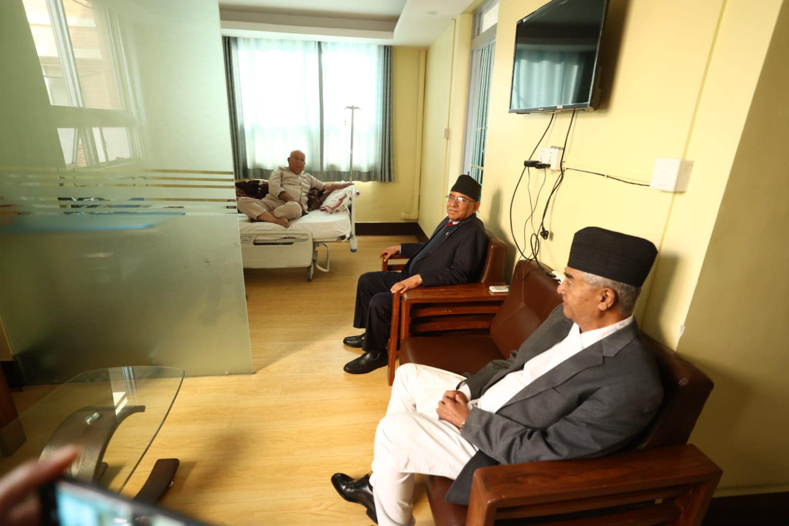 काठमाडाैं । नेकपा (एकीकृत समाजवादी) का अध्यक्ष माधवकुमार नेपाललाई भेट्न प्रधानमन्त्री शेरबहादुर देउवा र नेकपा माओवादी केन्द्रका अध्यक्ष पुष्पकमल दाहाल सँगै अस्पताल पुग्नुभएकाे छ ।