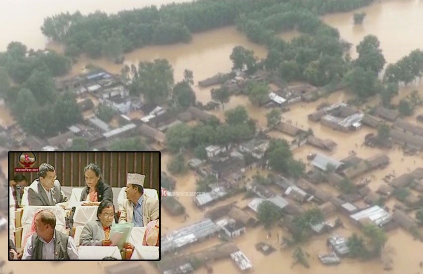 उक्त प्रस्तावमाथिको छलफलमा भाग लिँदै नेपाली कांग्रेस संसदीय दलका सचेतक ईश्वरी न्यौपानेले तराई–मधेसमा डुबानका कारण २५ हजारभन्दा बढी घरबारबिहीन भएका तथा एउटा गाउँबाट अर्काे गाउँमा जान डुंगाको प्रयोग गर्नुपर्ने अवस्थामा यसलाई लिएर राजनीतिकरण गर्न नहुने बताइन् ।