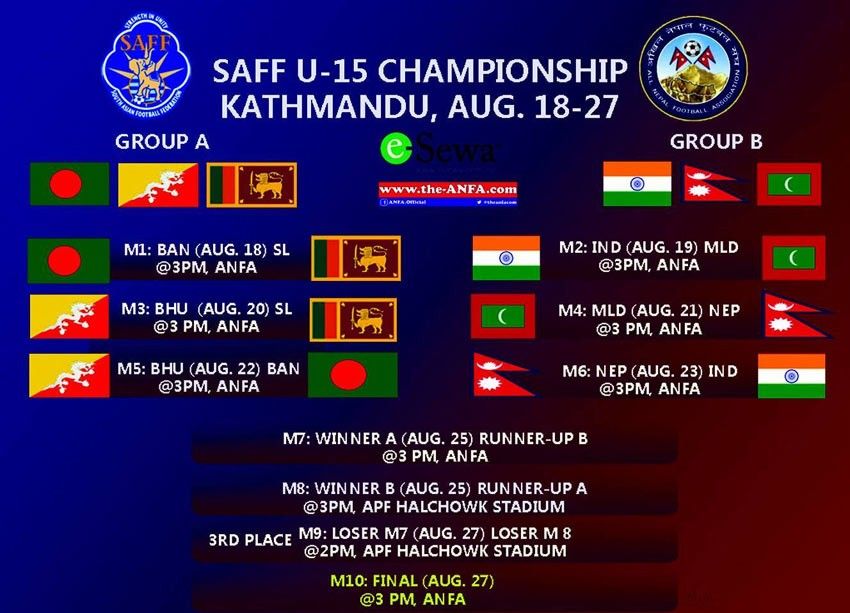 समूह ‘ए’मा बंगलादेश, भुटान र श्रीलंका रहेका छन् भने समूह ‘बी’मा नेपालसहित भारत र माल्दिभ्स छन् । समूहका शीर्ष दुई टिम सेमिफाइनलमा पुग्नेछन् ।