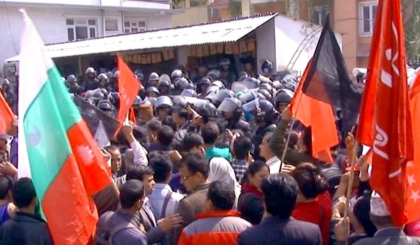 आइतबार निर्वाचन आयोगको केन्द्रीय कार्यालयमा भएको धर्नामा प्रहरीले ज्यादती गरेको विरोध र निर्वाचन चिन्ह पाउनुपर्ने माग गर्दै धर्ना बसेका प्रर्दशनकारीहरुले सरकारविरुद्ध चर्को नाराबजी गरेका थिए ।