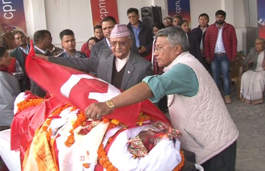 अध्यक्ष ओलीले दुलारीको पार्थिव शरीरमा पार्टीको झन्डा ओढाएका थिए ।