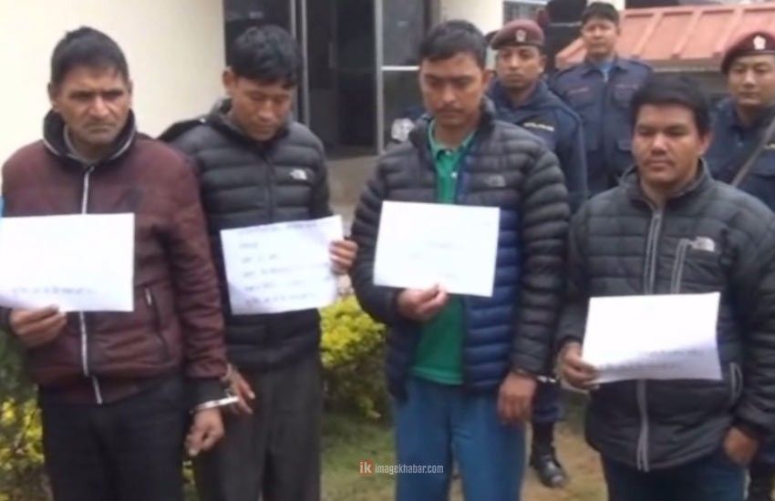 कालिका गाउँ विकास समिति वडा नम्बर–९ कर्णालीपुरबाट सुर्खेत, घुमखहरे–७ का ५८ वर्षीय मानबहादुर वली, सिन्धुपाल्चोक धुमथांग–२ का ३४ वर्षीय पोक्चे तामाङ, म्याग्दी, झम्किली–६ का ४३ वर्षीय धनवीर पुन र खैरीचन्दनपुर–४ बर्दियाका ३७ वर्षीय रतनबहादुर विकलाई प्रहरीले पक्राउ गरी मंगलबार सार्वजनिक गरेको हो ।