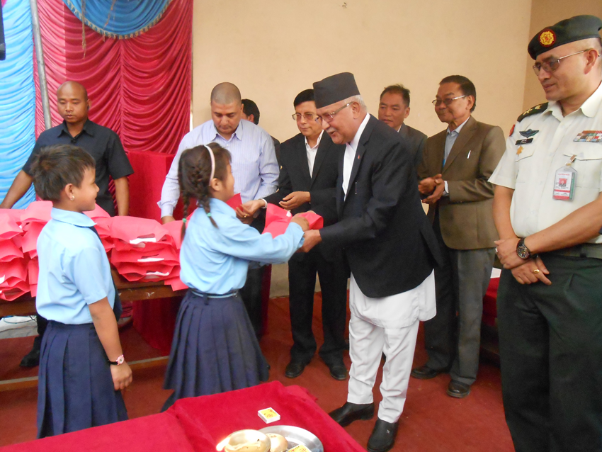 Kathmandu, April 26: “Hello students, are you happy? I trust you are happy today,” Prime Minister KP Sharma Oli asked students of Mahendra Rastriya Higher Secondary School close to the PM official residence at Baluwatar in the Capital today.