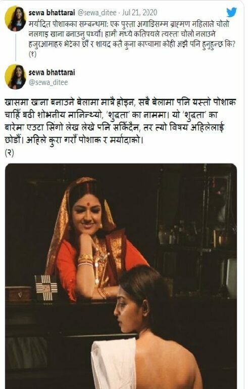 पत्रकार सेवा भट्टराईले ‘मर्यादित पोशाकका सम्बन्धमा’ भन्दै ट्वीटमा लेखेकि छन, ‘एक पुस्ता अगाडिसम्म ब्राह्मण महिलाले चोलो नलगाई खाना बनाउनु पर्थ्यो। हामी मध्ये कतिपयले त्यस्ता चोलो नलाउने हजुरआमाहरु भेटेका छौं र शायद कतै कुना काप्चामा कोही अझै पनि हुनुहुन्छ कि ?’