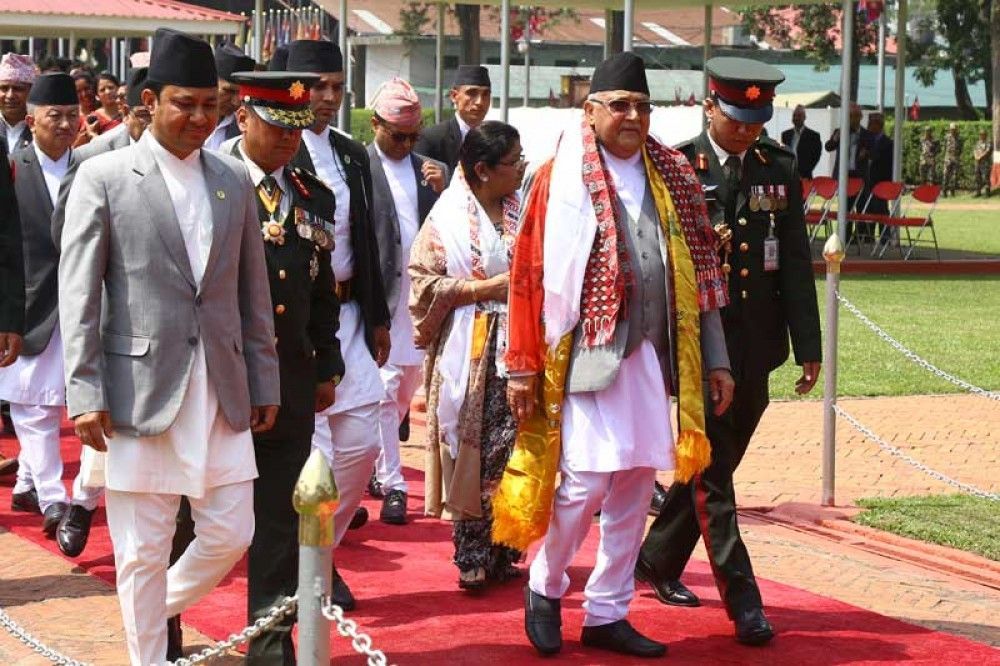On the occasion, a contingent of Nepal Army presented a guard of honour to the Head of the Government. Ministers, government senior officers, chiefs of security bodies and chiefs of Nepal-based diplomatic missions were also in attendance.