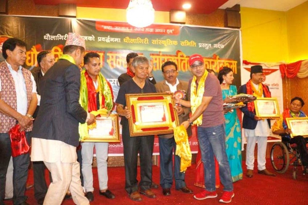 ‘श्रष्टा, सम्मान र समय हाम्रा आधार हुन्’ भन्ने मुल नाराका साथ आयोजित कार्यक्रममा ‘धौलागिरी साधना सम्मान’बाट गायक जीवन शर्मा, खड्ग गर्बुजा र बिमलराज क्षेत्रीलाई सम्मानित गरिएको थियो ।