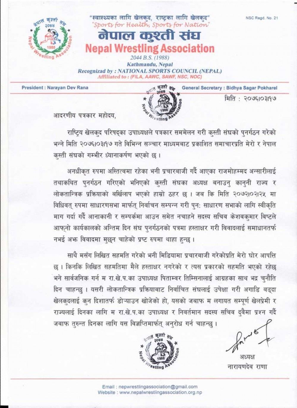 पुनगर्ठनको नाममा नेपाल ओलम्पिक कमिटीको मान्यताप्राप्त राजमोहम्मद अन्सारी नेतृत्वको कुस्ती संघलाई मान्यता दिनु कानुनी राज्य र लोकतान्त्रिक प्रक्रियाको बर्खिलाप भएको राणाले बताएका छन् ।