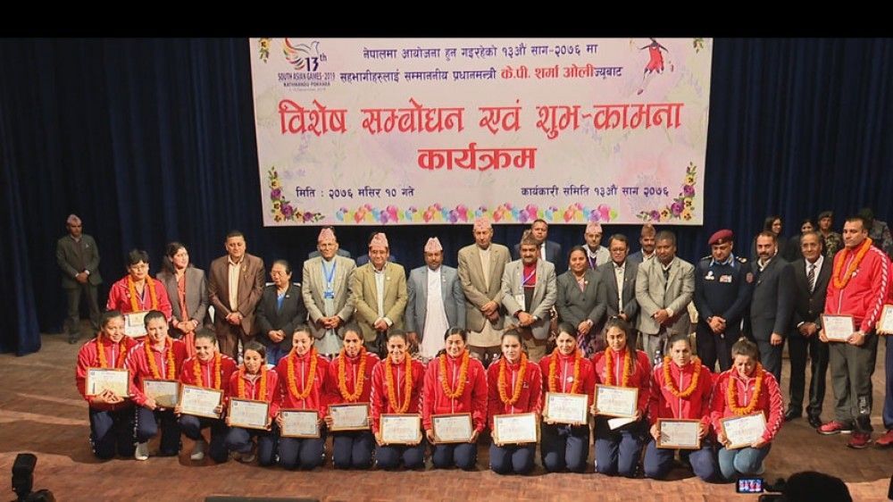 अर्थमन्त्री युवराज खतिवडाले आज राजधानीमा आयोजित एक विशेष समारोहमा खेलाडीहरुलाई जनही तीन लाख रुपैंयाको नगद पुरस्कारसहित सम्मान गरे ।