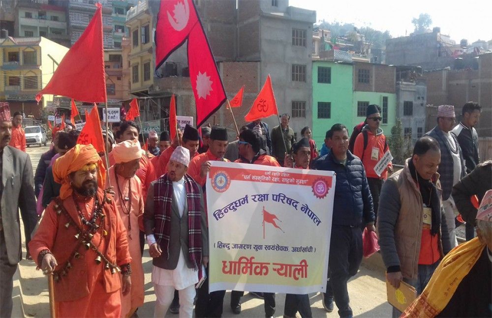 हिन्दुधर्म रक्षा परिषद्ले बाजागाजासहित आयोजना गरेको र्यालीले बजार परिक्रम गरेको थियो । हिन्दू जागरण युवा स्वयंसेवकमा आबद्ध भएकाहरुलाई प्रशिक्षण दिने उद्धेश्यले कार्यक्रम गरिएको आयोजकले जनाएका छन् ।