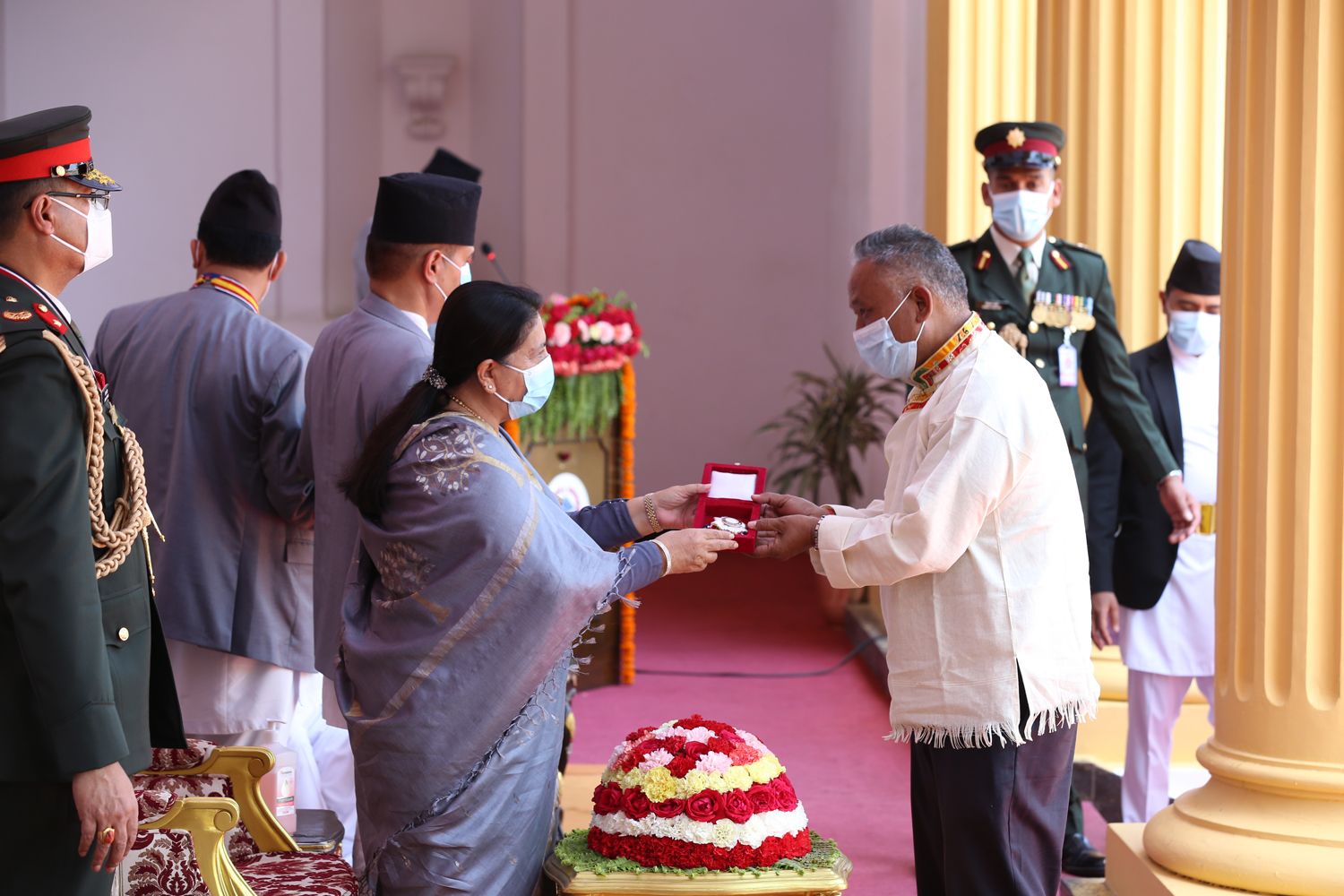 काठमाडौं । राष्ट्रपति विद्यादेवी भण्डारीले विभिन्न क्षेत्रमा विशिष्ठ योगदान पुर्याएका व्यक्तिहरूलाई विभुषित गर्नुभएको छ ।