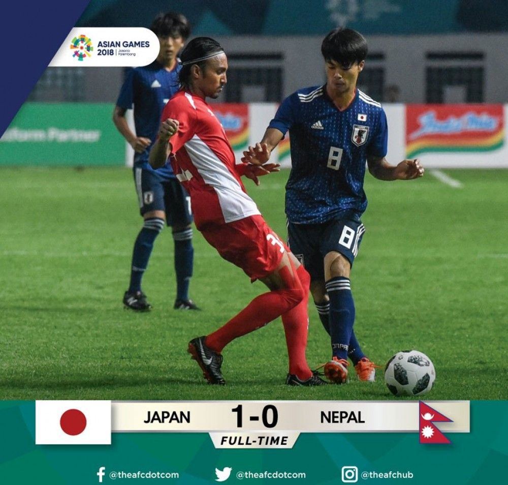 इन्डोनेसियामा सुरु भएको एसियाडको १८औं संस्करणको पहिलो खेलमा नेपाल मंगलबार जापानसँग १–० ले पराजित भएको हो ।