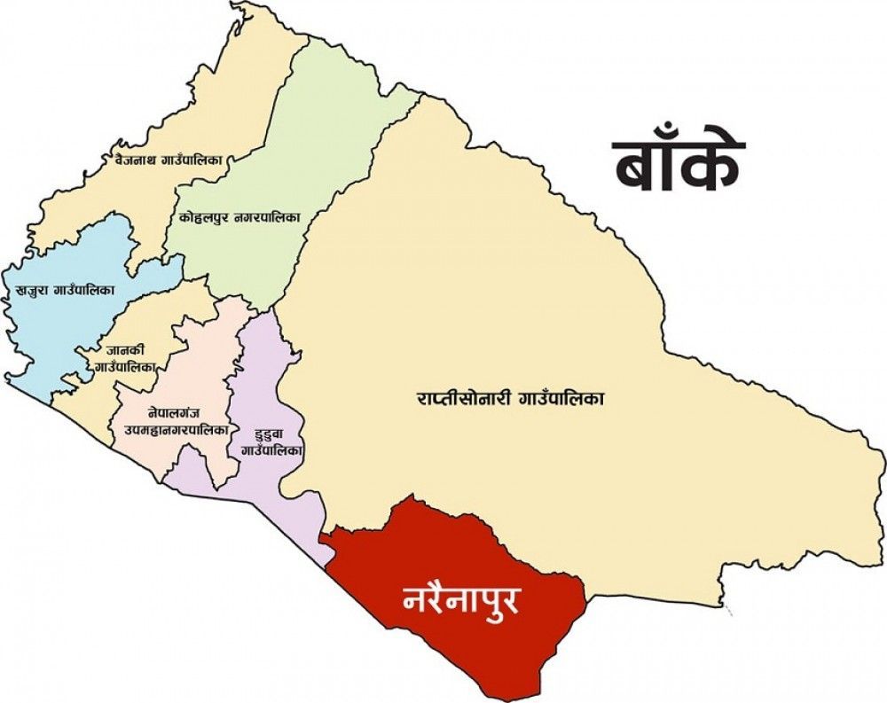 सदरमुकाम नेपालगञ्जदेखि करीब ३५ किलोमिटर दक्षिणपूर्व राप्तीपारि भारतसँग सीमा जोडिएको नरैनापुर गाउँपालिकामा छ वटा वडा छन् ।