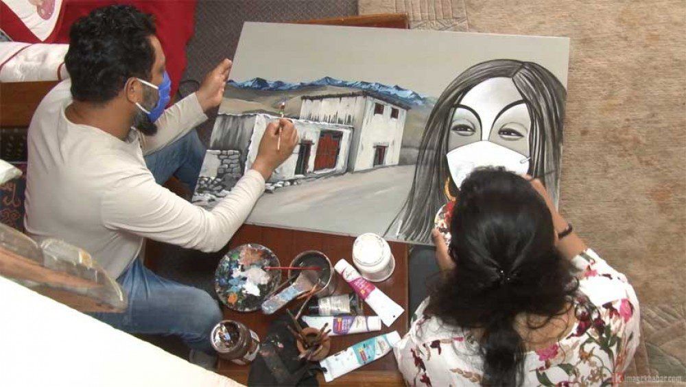 सृजनाका लागि लकडाउनको समय उपयोग गर्दै कलाकार दम्पती एरिना ताम्राकार र आशा डंगोलले एउटै क्यानभासमा कोरोनासम्बन्धी कला सृजना कोरिरहेका छन् ।