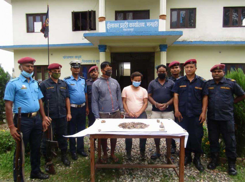 जिल्ला प्रहरी कार्यालय मकवानपुरअन्तर्गत् इलाका प्रहरी कार्यालय मनहरीले मनहरी गाउँपालिका–७ मा दुर्लभ वन्यजन्तु सालकको ६५० ग्राम खपेटासहित तीनजनालाई पक्राउ गरेको हो ।