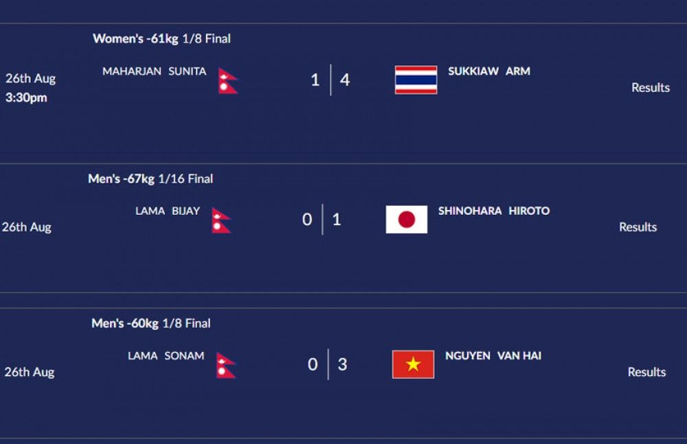 यसैगरी पुरुष ६७ केजी मुनिको तौल समूहमा नेपालका बिजय लामालाई जापानका खेलाडी हिरोतो सिनोहाराले १–० ले पाखा लगाए ।