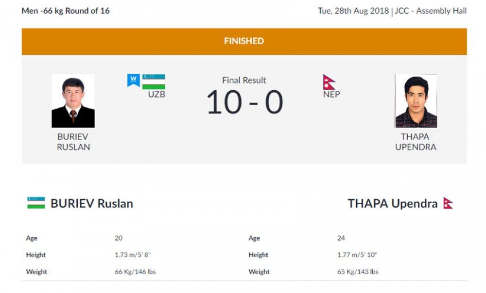 जकार्तास्थित जैसीसी हलमा भएको पुरुष ६६ केजीमुनिको तौल समूहको प्रिक्वार्टरफाइनल खेलमा नेपालका उपेन्द्र थापालाई उज्वेकिस्तानका खेलाडी रुस्लान बुरिएभले १०–० ले हराए ।