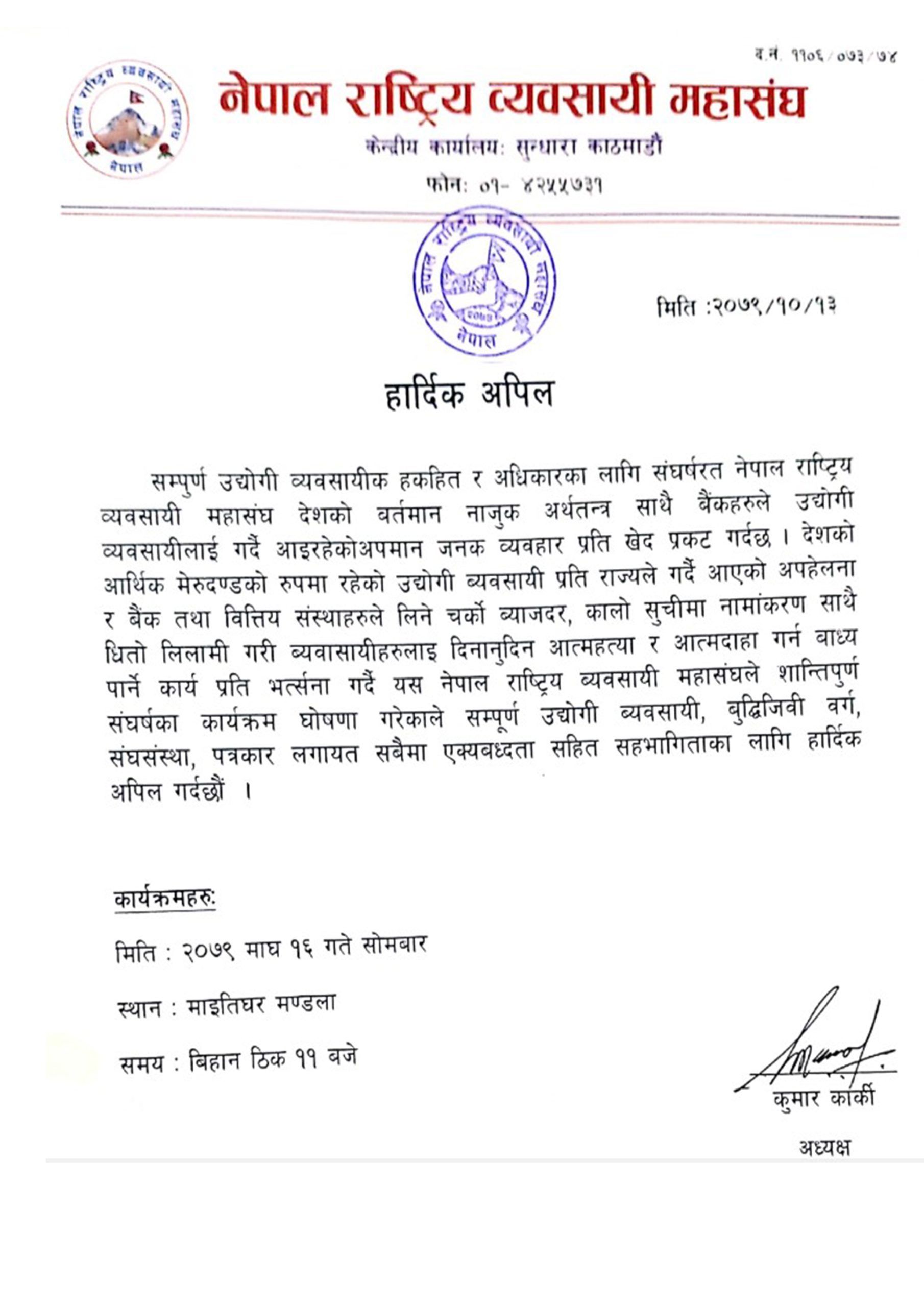 त्यस्तै, बैंकहरुले लिने चर्को ब्याजदर, कालोसूचीमा उद्योगी व्यवसायीको नामाकरण तथा धितो लिलामी गरी व्यवसायीहरु दिनप्रति दिन आत्माहत्या र आत्मदाह गर्न बाध्य पार्ने कामको खण्डन गर्दै शान्तिपूर्ण आन्दोलनको घोषणा गरेको हो ।