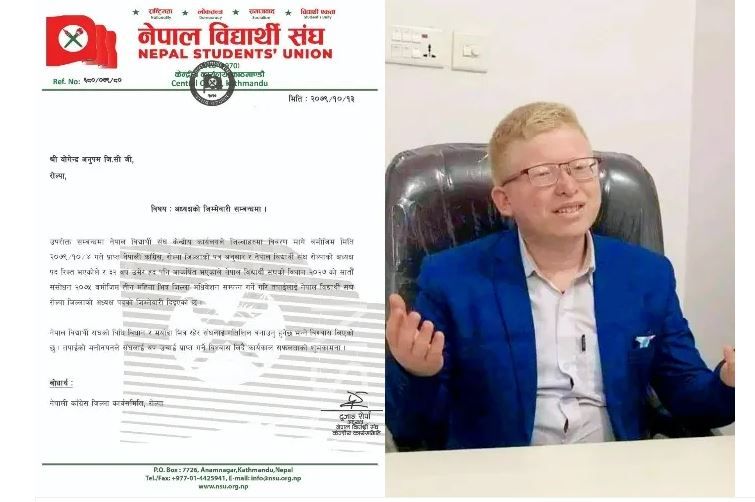 नेपाल विद्यार्थी संघ रोल्पाको अध्यक्ष पद रिक्त रहेको र वर्तमान विधानअनुसार ३२ वर्ष उमेर हद पनि आकर्षित भएकोले नेपाल विद्यार्थी संघको विधान २०२७ र छैठौ शंसोधन २०७५ बमोजिम अध्यक्षको जिम्मेवारी दिइएको हाे ।