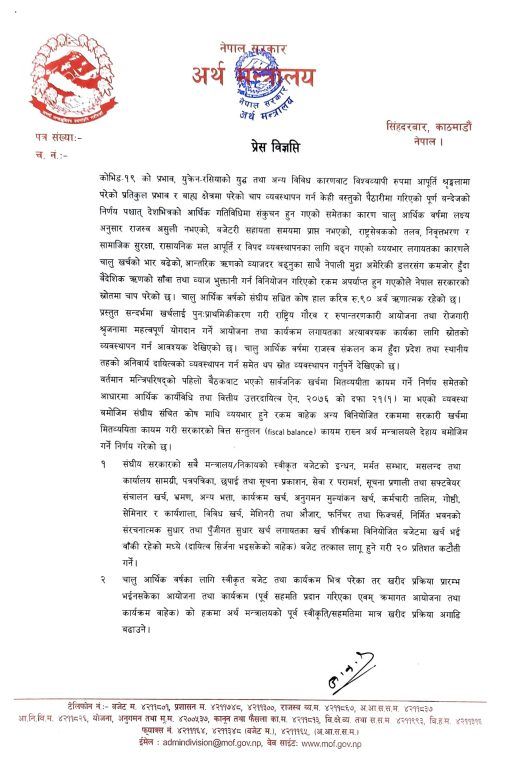 अर्थ मन्त्रालयले मंगलबार प्रेस विज्ञप्ति जारी गर्दै खर्च कटाैती र खर्च राेक्का गर्ने निर्णय गरेकाे हाे। चालू आर्थिक वर्षको संघीय सञ्चित कोष ९० अर्ब ऋणात्मक रहेको देखाएको छ।