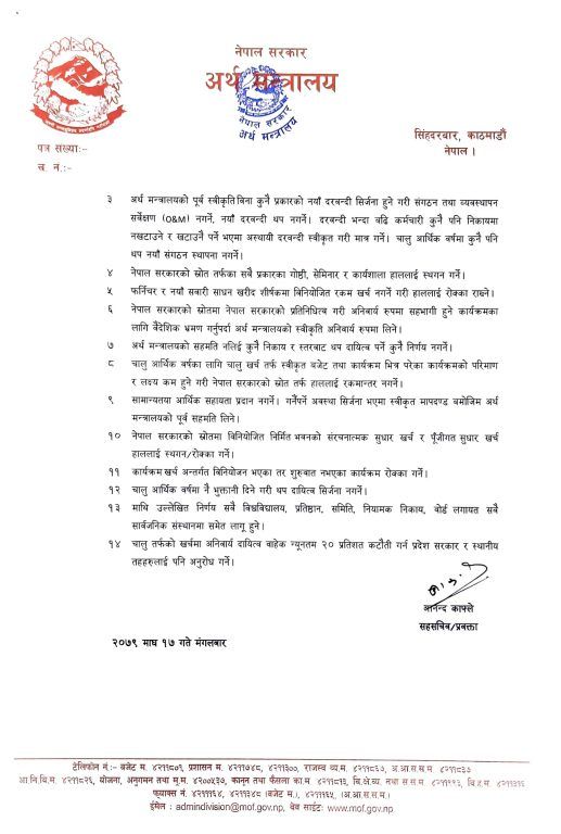 अर्थ मन्त्रालयले चालू आर्थिक वर्षको बजेट र खर्चमा मितव्ययिता गरी सरकारको वित्त सन्तुलन कायम राख्न खर्च कटौती र खर्च रोक्का गर्ने निर्णय गरेको छ।