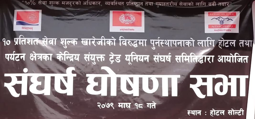 संघर्ष समितिले बुधबार काठमाडौंमा विरोध सभा गर्दै चरणबद्ध आन्दोलन घोषणा गरेको हो । ट्रेड युनियन संघर्ष समितिले होटल तथा पर्यटन क्षेत्रमा काम गर्ने कर्मचारीहरुले खाइपाइ आएको सेवासुविधा कटौती भएको भन्दै विरोधका कार्यक्रम घोषणा गरेको छ ।