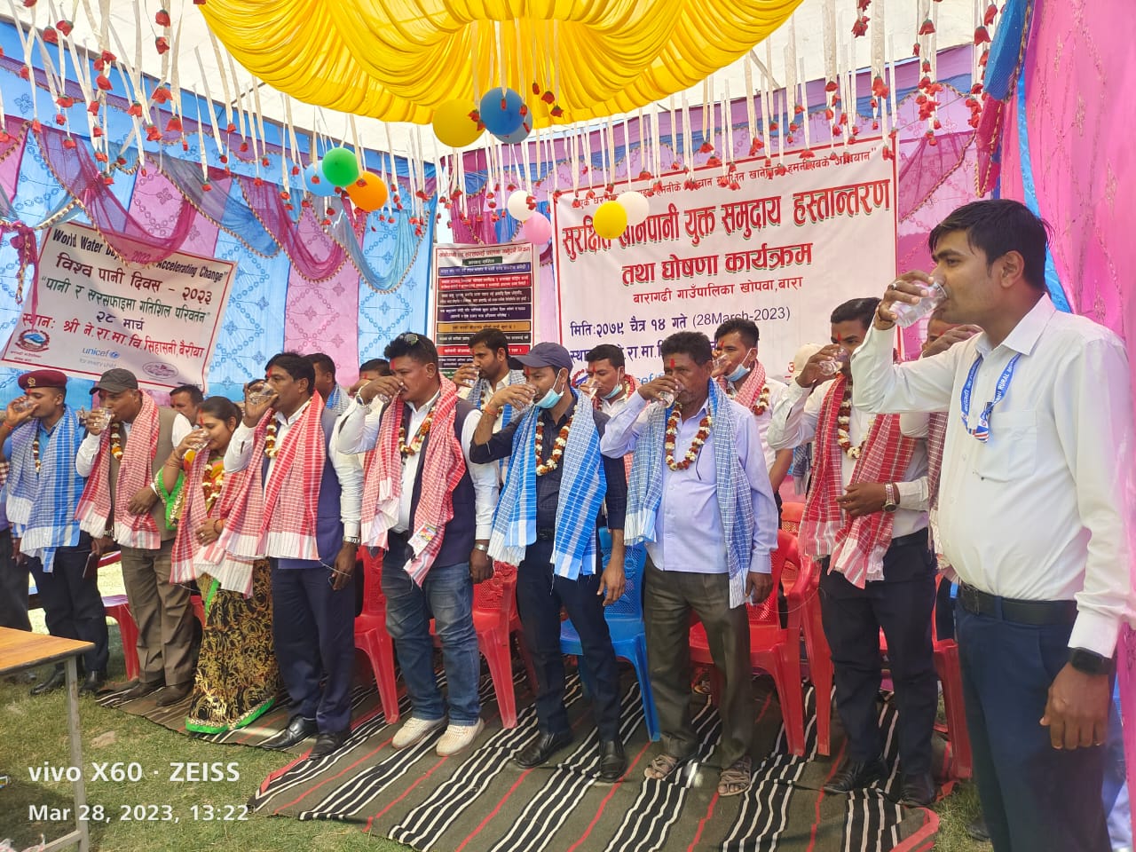 घोषणा कार्यक्रमका प्रमुख अथिति गाउँपालिका अध्यक्ष अशाेक कुमार जयसवालले हामीले हाम्रो कार्यकालमा सुरक्षित खानेपानी युक्त समुदाय घोषणा गर्न पाएकाेले गर्भ महशुस भएकाे बताउनु भयाे ।