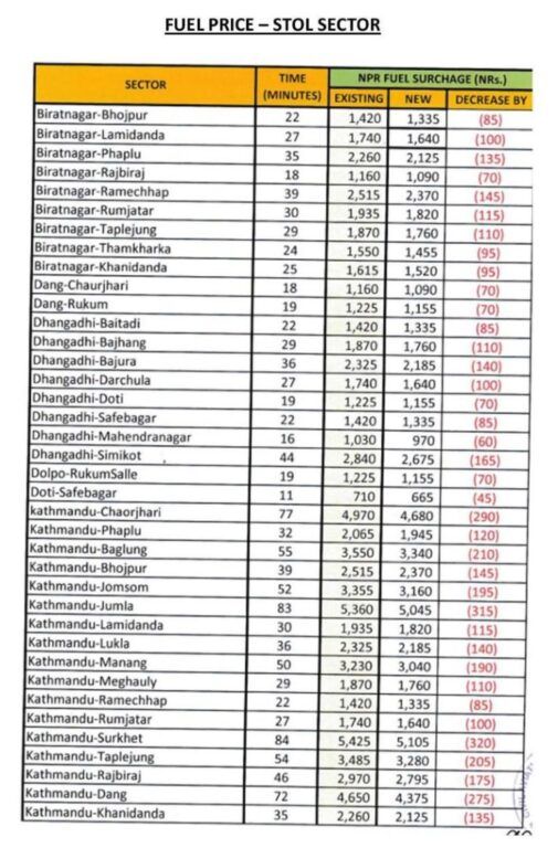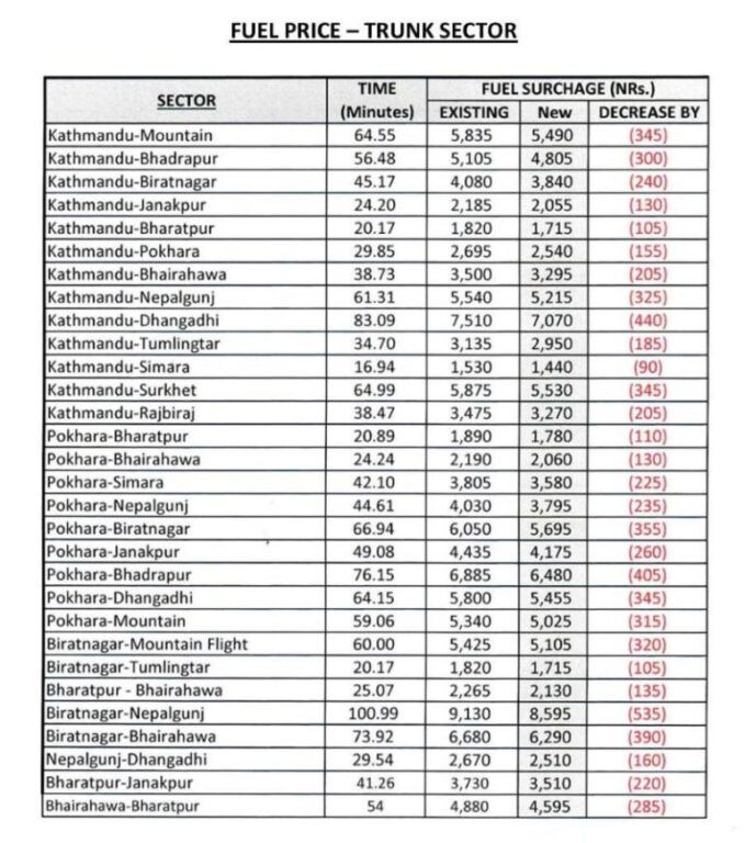काठमाडौं । सरकारले इन्धनको मूल्यमा प्रतिलिटर १० रुपैयाँ कटौती गरेसँगै हवाई भाडा समेत घटेको छ ।