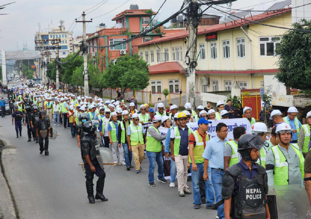 काठमाडौं । नेपाल निर्माण व्यवसायी महासंघको दोस्रो चरणको आन्दोलन अन्र्तगत बुधवार राजधानीमा देशभरका निर्माण व्यवसायीहरूले सेफ्टी हेल्मेट र ज्याकेट लगाई हातमा कालो पट्टी बाँधेर सिठ्ठी जुलुश गरेका छन् ।