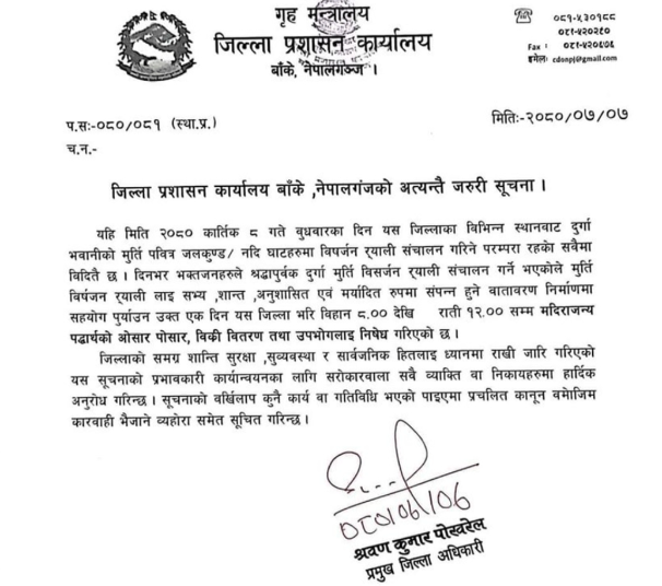 विजया दशमीको भोलिपल्ट अर्थात् एकादशीका दिन दुर्गा मूर्ति विसर्जन गर्न विभिन्न स्थानमा गरिने ¥यालीलाई सभ्य, शान्त, अनुशासित एवं मर्यादित बनाउन कात्तिक ८ गते बिहान ८ बजेदेखि मध्यरात १२ बजेसम्म मदिरा तथा मदिराजन्य वस्तु ओसारपसार, बिक्री–वितरण एवं उपभोग गर्न निषेध गरिएको सूचनामा उल्लेख छ ।