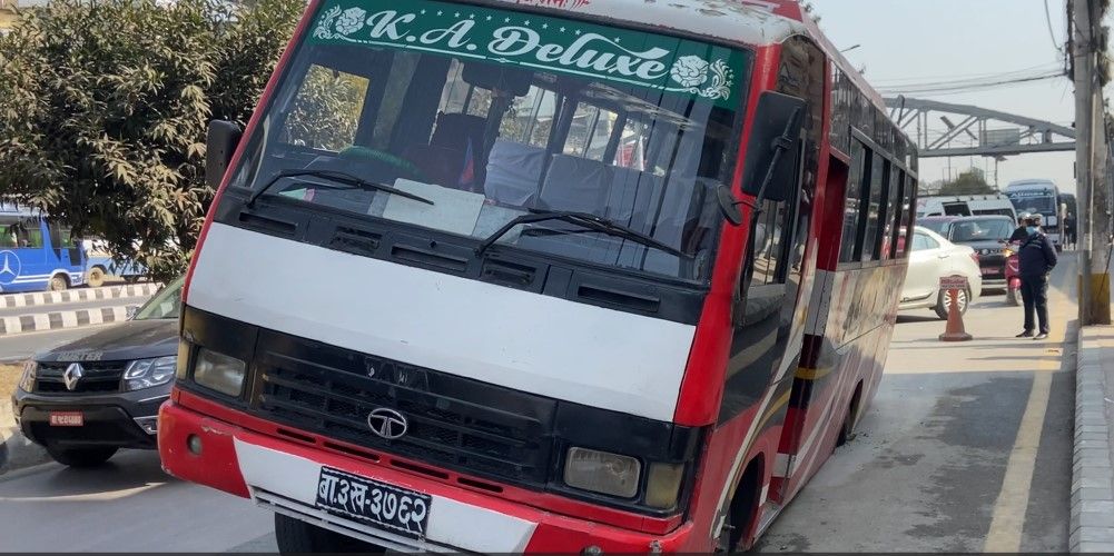 काठमाडौं । काठमाडौंको नयाँबानेश्वरको सडकमा गुडिरहेको बस भासिएको छ । भक्तपुरबाट रत्नपार्कतर्फ जाँदै गरेको बा ३ ख ३७६२ नम्बरको गुडिरहेको बसको चक्का फसेको हो ।