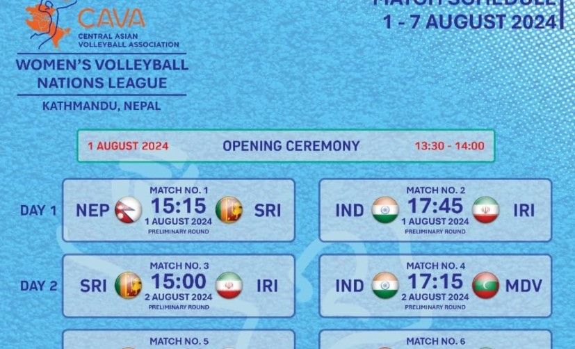 यस्तै नेपालले दोस्रो खेलमा भोलि भारतसँग, तेस्रो खेलमा २० गते आइतवार माल्दिभ्ससँग र चौथो खेलमा २१ गते सोमवार इरानसँग खेल्ने तालिका छ ।