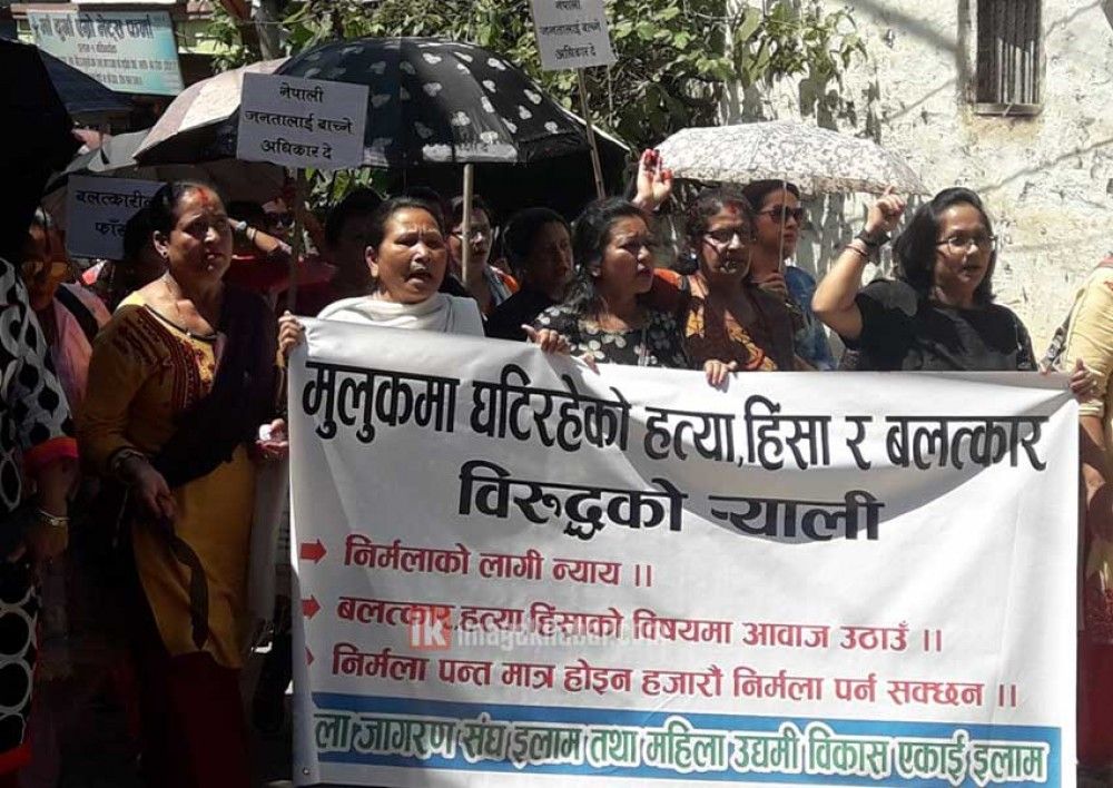 महिला जागरण संघ इलाम र महिला उद्यमी विकास एकाई इलामले आयोजना गरेको र्‍यालीमा स्थानीय महिलाहरुको उल्लेख्य सहभागिता थियो । निर्मलाको हत्यारालाई कारवाही गर्न ढिलो गरेकाले विरोधमा उत्रन बाध्य भएको महिला जागरण संघ इलामकी अध्यक्ष बिष्णु दाहालले जानकारी दिइन् ।