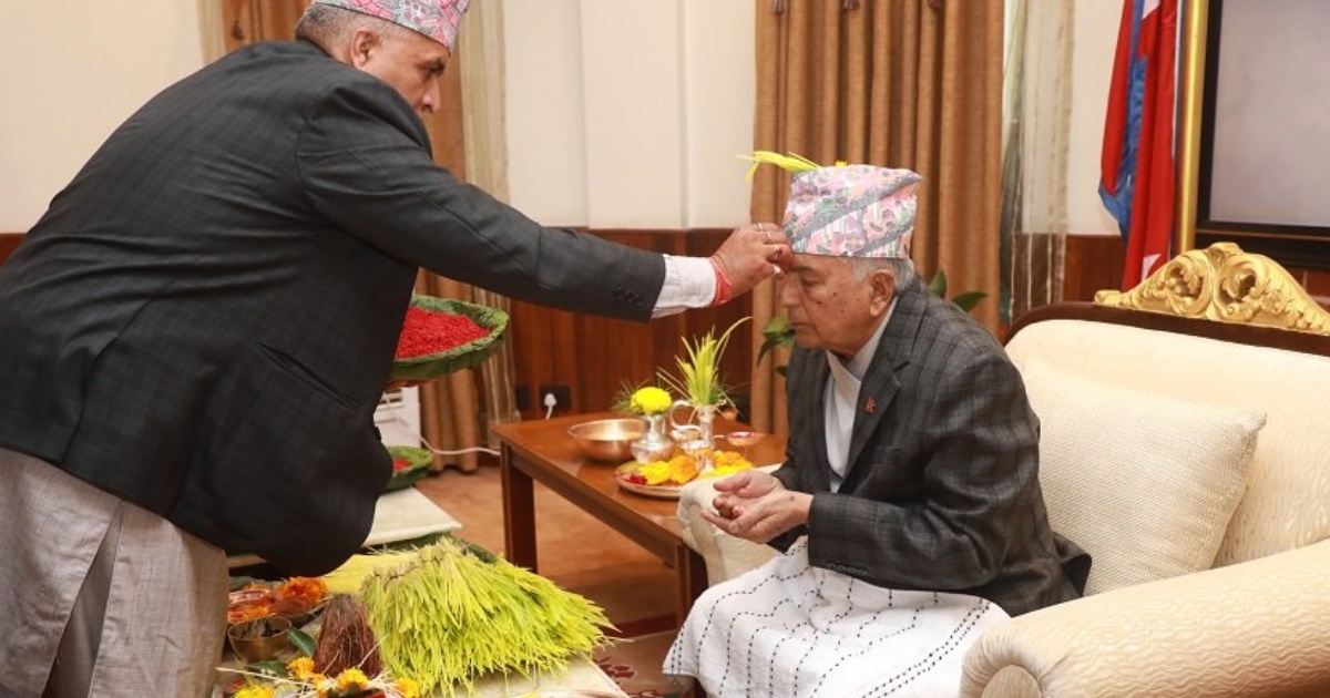 राष्ट्रपति पौडेलले पुरोहितद्वय अर्जुन अधिकारी र देवराज अर्यालकाे हातबाट शुभ साइतमा टीका र जमरा लगाउनुभएकाे हाे । राष्ट्रपति भवन शीतल निवासमा राष्ट्रपति पौडेलले टीका लगाएकाे राष्ट्रपति कार्यालयले जनाएकाे छ।