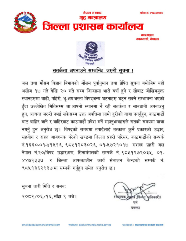 विपदकाे समयमा तत्काल कुनै प्रकारको उद्धार, सहयोग र राहत आवश्यक परेको खण्डमा जिल्ला प्रहरी परिसर काठमाडौंको सम्पर्क नम्बरहरूमा सम्पर्क गर्न समेत अनुराेध गरिएकाे छ। जल तथा मौसम विज्ञान विभागको मौसम पूर्वानुमान तथा प्रेषित सूचना अनुसार शुक्रबारदेखि यहि असोज २० गतेसम्म काठमाडौंमा भारी वर्षा हुने सम्भावना छ ।
