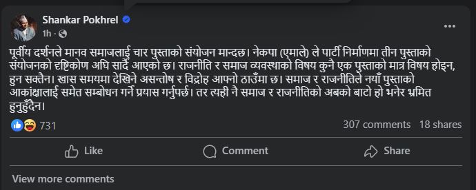 महासचिव पोख्रेलले शुक्रबार दिउँसाे सामाजिक सञ्जालमार्फत यस्ताे बताउनुभएकाे हाे । पूर्वीय दर्शनले मानव समाजलाई ४ पुस्ताको संयोजन मान्ने बताउँदै उहाँले राजनीति र समाज व्यवस्थाको विषय कुनै एक पुस्ताको मात्र विषय हुन नसक्ने बताउनुभएकाे छ।