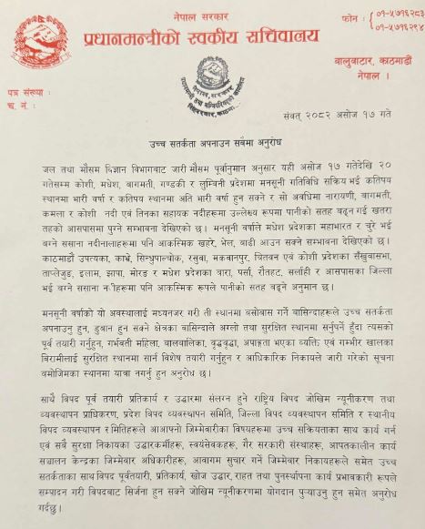 प्रधानमन्त्रीको स्वकीय सचिवालयले शुक्रबार साँझ एक विज्ञप्ति जारी गर्दै यस्ताे अनुराेध गरेकाे हाे । जल तथा मौसम विज्ञान विभागले जारी गरेकाे पूर्वानुमान अनुसार भारी वर्षाको सम्भावना रहेका कारण उत्पन्न हुन सक्ने जोखिमबाट बच्च उच्च सतर्कता अपनाउन अनुरोध गरिएकाे छ । जारी विज्ञप्तिमा विभागले असोज १७ देखि २० गतेसम्म देशका अधिकांश भागमा भारी वर्षाको अनुमान गरिएकाले जलसतह बढ्नेदेखि खोलानालामा पानीको बहाव बढ्ने सक्ने स्थिति तर्फ समेत सबैपक्षको ध्यानाकर्षण गराइएको छ ।
