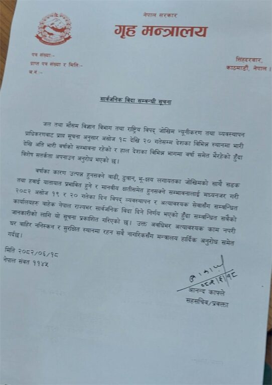 देशैभरी आएको अविरल वर्षासँगैको प्रतिकूल अवस्थालाई मध्यनजर गर्दै थप २ दिन बिदा दिने निर्णय भएको गृह मन्त्रालयले जनाएकाे हाे। सरकारी कार्यालयहरू आइतबारदेखि खुल्ने तय भएको थियो । तर, राजमार्गहरूमा खसेको पहिरो र मौसम पूर्वानुमान महाशाखाले जारी गरेको अलर्टलाई ध्यानमा राख्दै बिदा दिने निर्णय भएको मन्त्रालयले शनिबार जारी गरेकाे सूचनामा भनिएकाे छ।