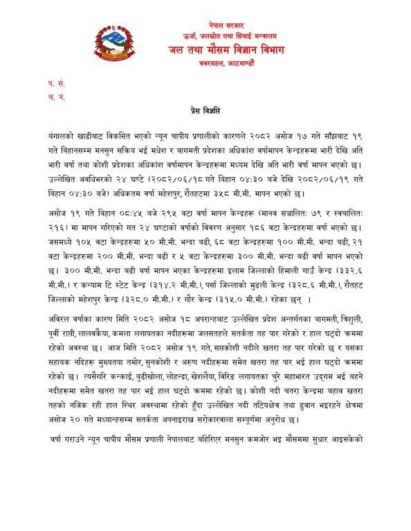 उहाँले असोज १७ गते साँझदेखि असोज १९ गते बिहानसम्म मनसुन सक्रिय रहँदा मधेश र बागमती प्रदेशका अधिकांश ठाउँमा भारीदेखि अति भारी वर्षा तथा कोशी प्रदेशका धेरै स्थानमा मध्यमदेखि अति भारी वर्षा भएको बताउनुभयाे । सोही अवधिमा २४ घण्टे अवधिभित्र सबै भन्दा बढी वर्षा रौतहटको महेशपुर केन्द्रमा ३ सय ५८ मिलिमिटर मापन गरिएको छ।