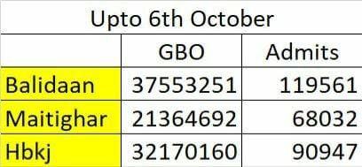 बोर्डले हाल प्रदर्शनरत ३ चलचित्र बलिदान, माइतीघर र हरिबहादुरको जुत्ताको कारोबार विवरण सार्वजनिक गरेको हो । यहि असोज १३ गतेदेखि असोज २० गते मध्यरातसम्मको बक्स अफिस विवरण अनुसार सर्वाधिक कमाइ बलिदानले गरेको छ । साेही चलचित्रले ३ करोड ७५ लाख ५३ हजार २ सय ५१ रुपैयाँ संकलन गरेको छ ।