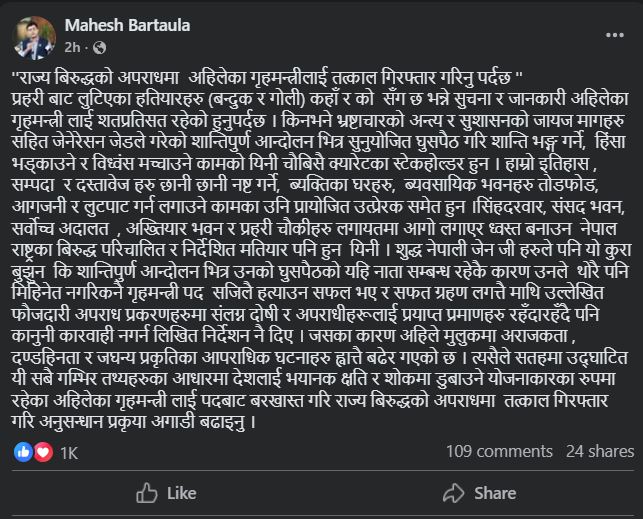 नेता बर्तौलाले बिहीबार बिहान सामाजिक सञ्जाल मार्फत यस्ताे बताउनुभएकाे हाे । गृहमन्त्री अर्याल व्यक्तिका घर, व्यावसायिक भवन तोड्फोड, आगजनी र लुटपाट गर्न लगाउने कामका प्रायोजित उत्प्रेरक रहेको उहाँकाे दावी छ। मन्त्री अर्यालले सिंहदरबार, संसद् भवन, सर्वोच्च अदालत , अख्तियार भवन र प्रहरी चौकी लगायतमा आगो लगाएर ध्वस्त बनाउन राष्ट्रविरुद्ध परिचालित- निर्देशित मतियार भएको समेत उहाँकाे दावी थियाे ।