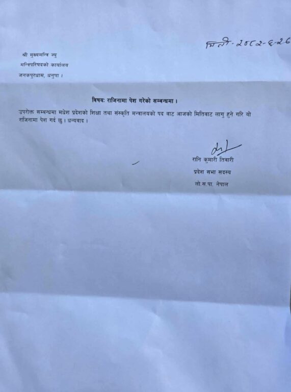 मधेश प्रदेशमा शिक्षा मन्त्री तिवारीले पदबाट राजीनामा दिइन् (राजीनामा पत्रसहित)