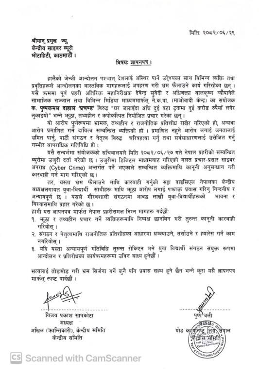 काठमाडौं । नेकपा माओवादी निकट वाईसीएल, अखिल क्रान्तिकारीले संयुक्त रूपमा पूर्वएआईजी देवेन्द्र सुवेदी र अधिवक्ता बालकृष्ण न्यौपानेविरुद्ध साइबर ब्यूरोमा उजुरी दर्ता गरेको छ।