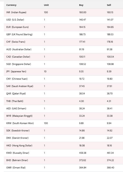 राष्ट्र बैंकले अमेरिकी डलर एकको खरिददर १ सय ४० रुपैयाँ ४७ पैसा र बिक्रीदर १ सय ४१ रुपैयाँ ०७ पैसा निर्धारण गरेको जनाएकाे हाे । अस्ट्रेलियन डलर एकको खरिददर ९१ रुपैयाँ १९ पैसा र बिक्रीदर ९१ रुपैयाँ ५८ पैसा, क्यानेडियन डलर एकको खरिददर १ सय रुपैयाँ ११ पैसा र बिक्रीदर १ सय रुपैयाँ ५४ पैसा तोकिएको छ ।