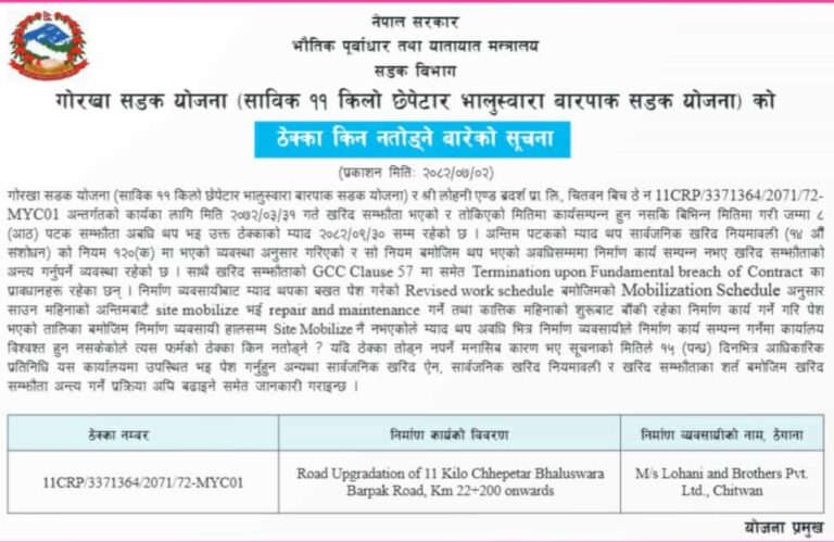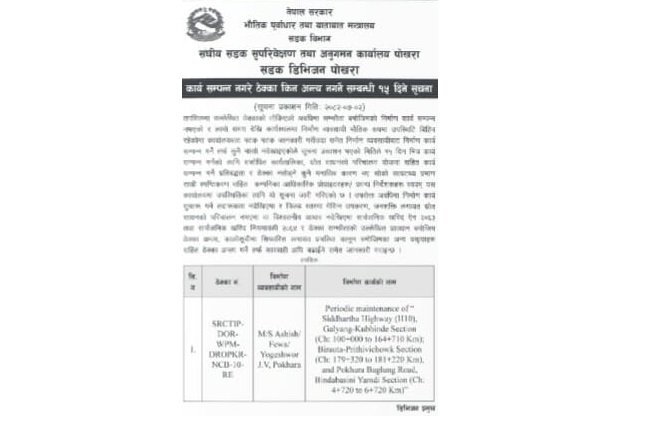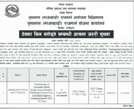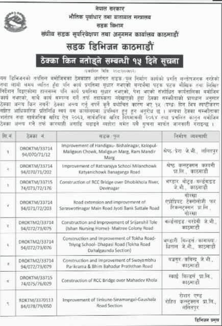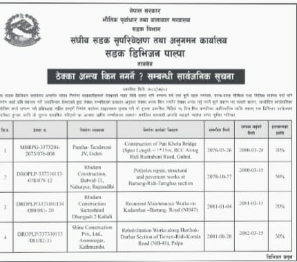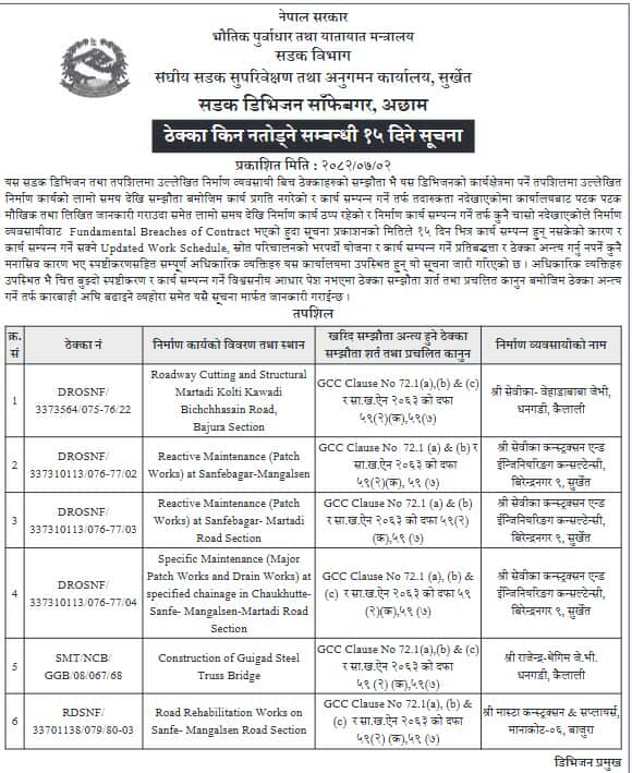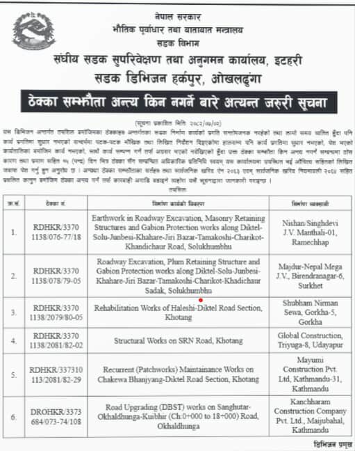 सडक डिभिजन कार्यालय काठमाडौंले ७, ओखलढुङ्गा तथा अछाम डिभिजनले ५-५, पाल्पाले ४, धनकुटा, पोखरा, मध्यपहाडी तथा गोरखा सडक योजनाले एक-एक गरी २५ वटा ठेक्का किन नतोड्ने भन्दै आइतबार सार्वजनिक सूचना जारी गरेका छन् ।