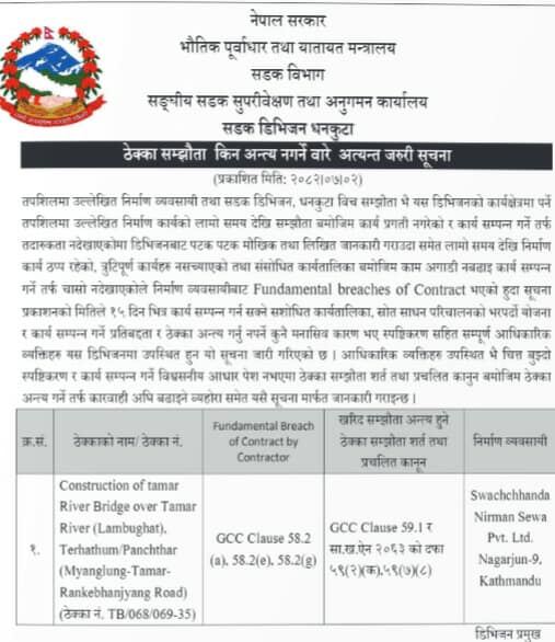 विभिन्न मितिमा लिखित तथा मौखिक रूपमा कार्य सम्पन्न गर्न अनुरोध तथा जानकारी गराउँदा समेत निर्माण व्यवसायीबाट निर्माण कार्य सम्पन्नतर्फ कुनै चासो नदेखाई ठेक्का सम्झौता उल्लङ्घन गरिएको जनाइएको छ ।