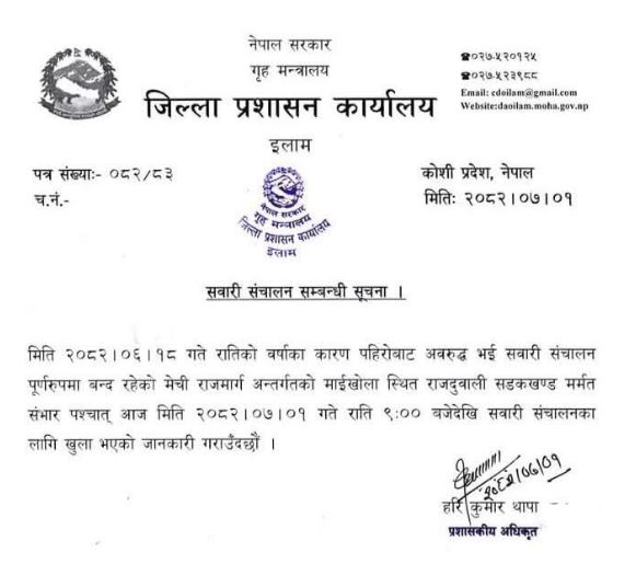 गत असोज १८ गतेको भीषण वर्षा र पहिरोका कारण इलामको माईखोला राजदुवाली खण्डमा पहिरोले सडक भत्किएपछि यातायात पूर्ण रूपमा ठप्प भएको थियो । झापा–इलाम–पाँचथर–ताप्लेजुङ जोड्ने मुख्य जीवनरेखा मानिने साेही राजमार्ग सञ्चालनमा आएसँगै स्थानीयवासीले राहतको सास फेरेका छन्।