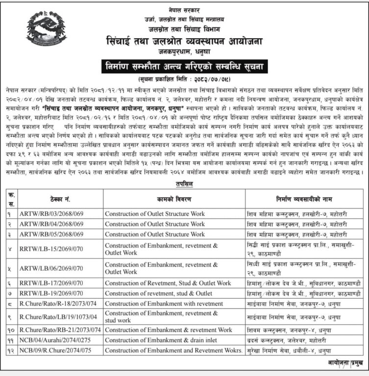 वर्षौंदेखि अलपत्र अवस्थामा रहेका सिँचाइतर्फका १२ वटा रुग्ण ठेक्का सम्झौता रद्द गरिएको छ भने सडक र पुल निर्माणका थप ४० वटा ठेक्का पनि खारेजीको प्रक्रियामा गएका छन् । ऊर्जा, जलस्रोत तथा सिँचाइ मन्त्री कुलमान घिसिङको निर्देशनपछि विकास आयोजनाहरूमा देखिएको सुस्तता हटाउन सरकारले यो कदम चालेको हो ।