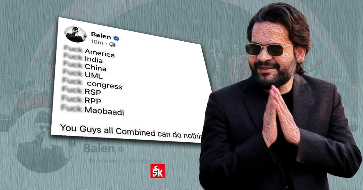 शनिबार मध्यराति सामाजिक सञ्जालमार्फत उनले लेखेको स्टाटसमा प्रयोग गरिएका शब्दले नयाँ राजनीतिक र कूटनीतिक तरंग ल्याएको छ। उक्त स्टाटसमा बालेनले दुई छिमेकी मुलुक-चीन र भारतसँगै अमेरिका र नेपालका प्रमुख राजनीतिक दलहरूको नाम उल्लेख गर्दै आलोचनात्मक अभिव्यक्ति दिएका थिए।